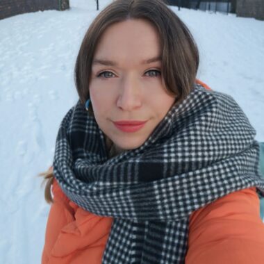 • Joanna Dawidowska has fair skin with dark blonde hair. She is wearing glasses, a blue scarf and a lilac top.